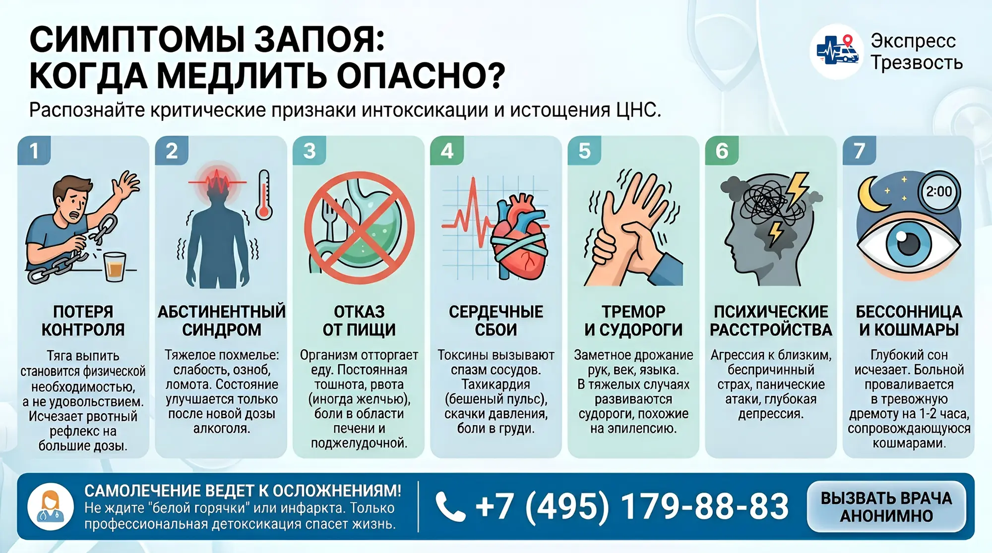 Запой — это критическая нагрузка на сердце, мозг и другие органы. Срочно вызывайте врача, если наблюдаются: